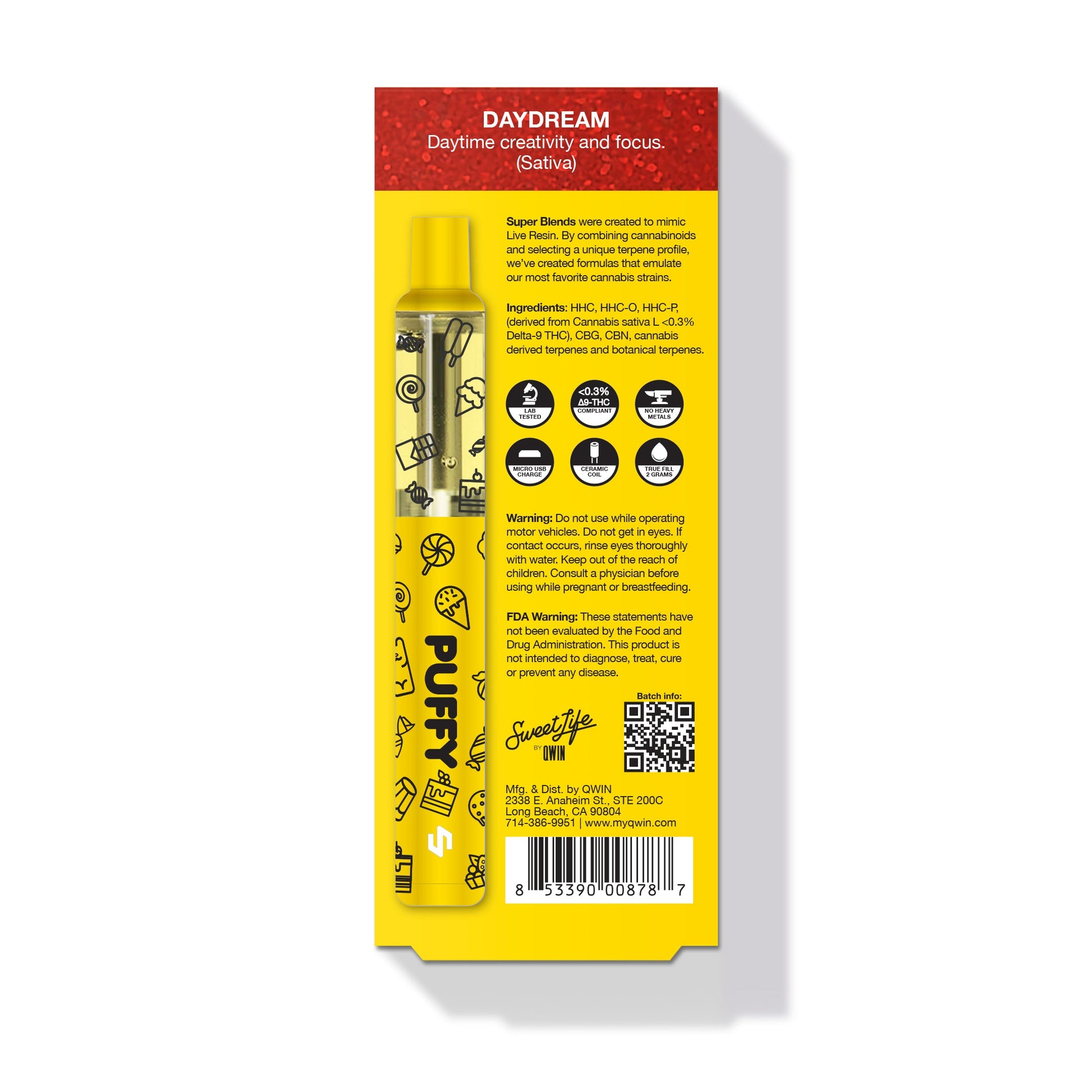 Laissez-vous transporter avec la Puff HHC "Daydream" de la gamme "Super Blend" par Puffy, composée de 2000 mg de cannabinoïdes variés. Conçue pour offrir des effets puissants et des saveurs uniques, cette puff utilise une Live Resin de cannabis riche en cannabinoïdes et terpènes, assurant une expérience de relaxation profonde et prononcée.